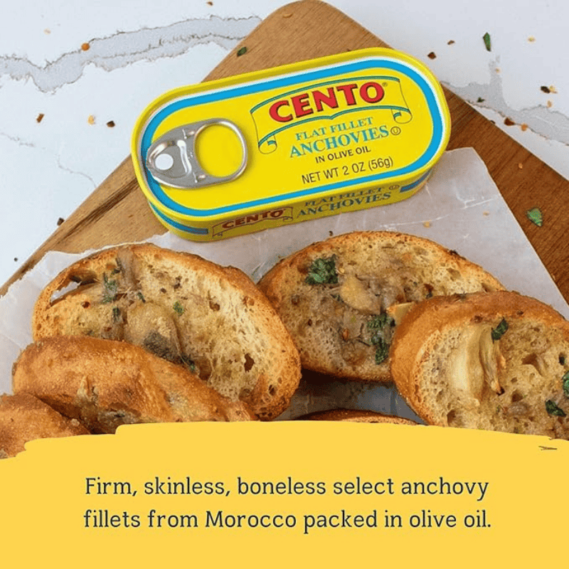 Cento Flat Fillet Anchovies in Olive Oil, 2 Oz, Firm, Skinless, Boneless, Canned Moroccan Anchovies, Easy to Open Pull Top Lid
